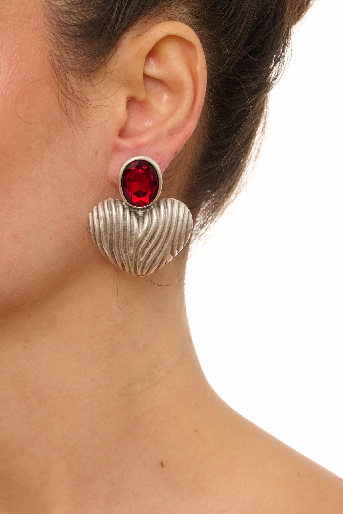 Kiraz Burgundy Crystal Stoned Silver Plated Heart Earring