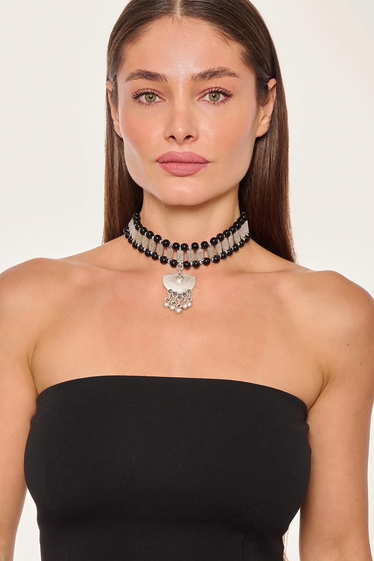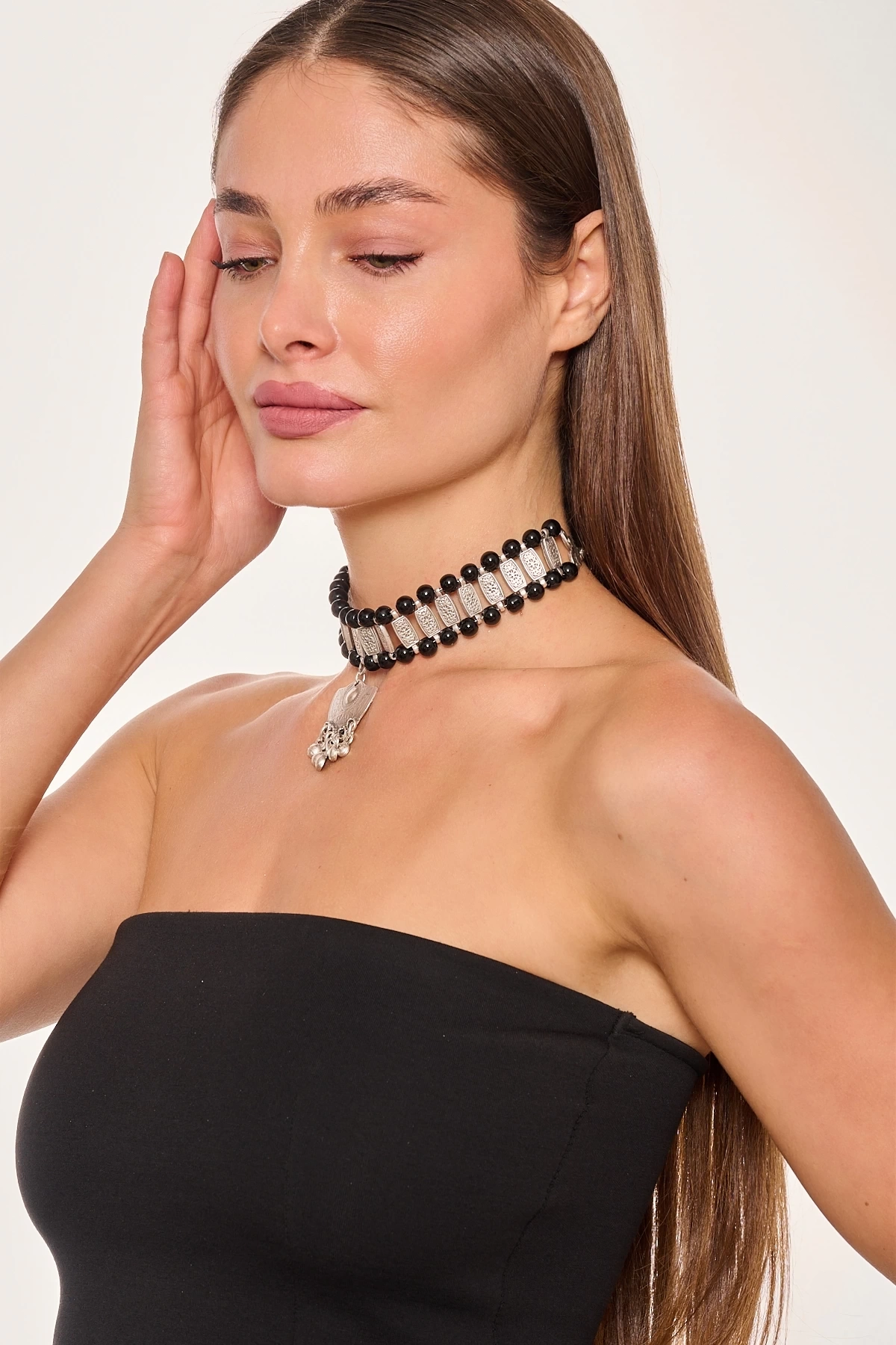 Kiraz Black Beaded Silver Plated Necklace
