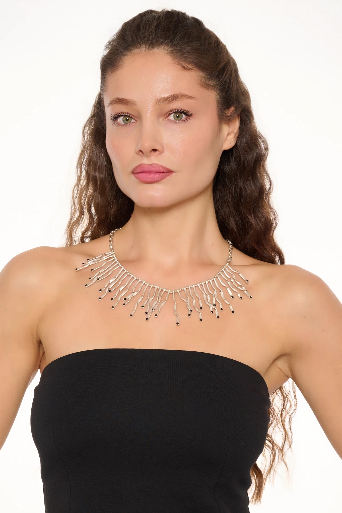 Kiraz Black Crystal Stoned Silver Plated Lightning Necklace