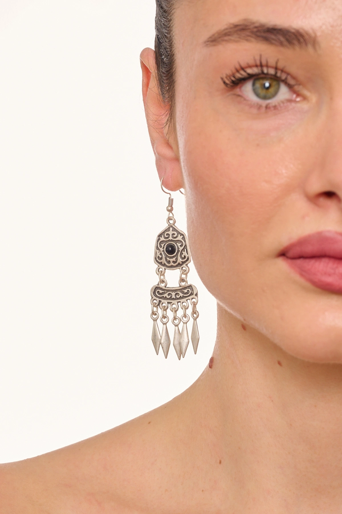 Kiraz Black Stoned Silver Plated Dangling Earring
