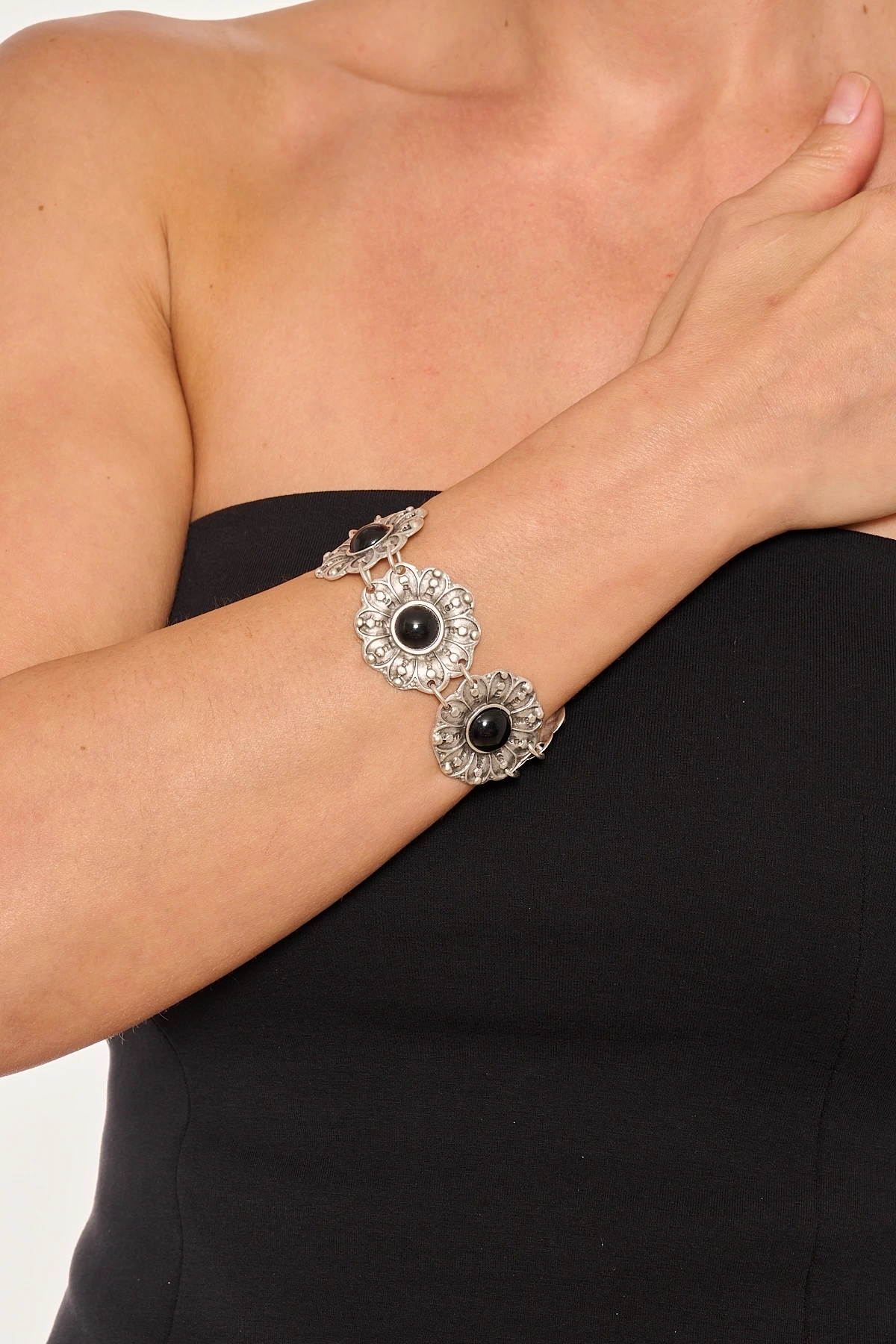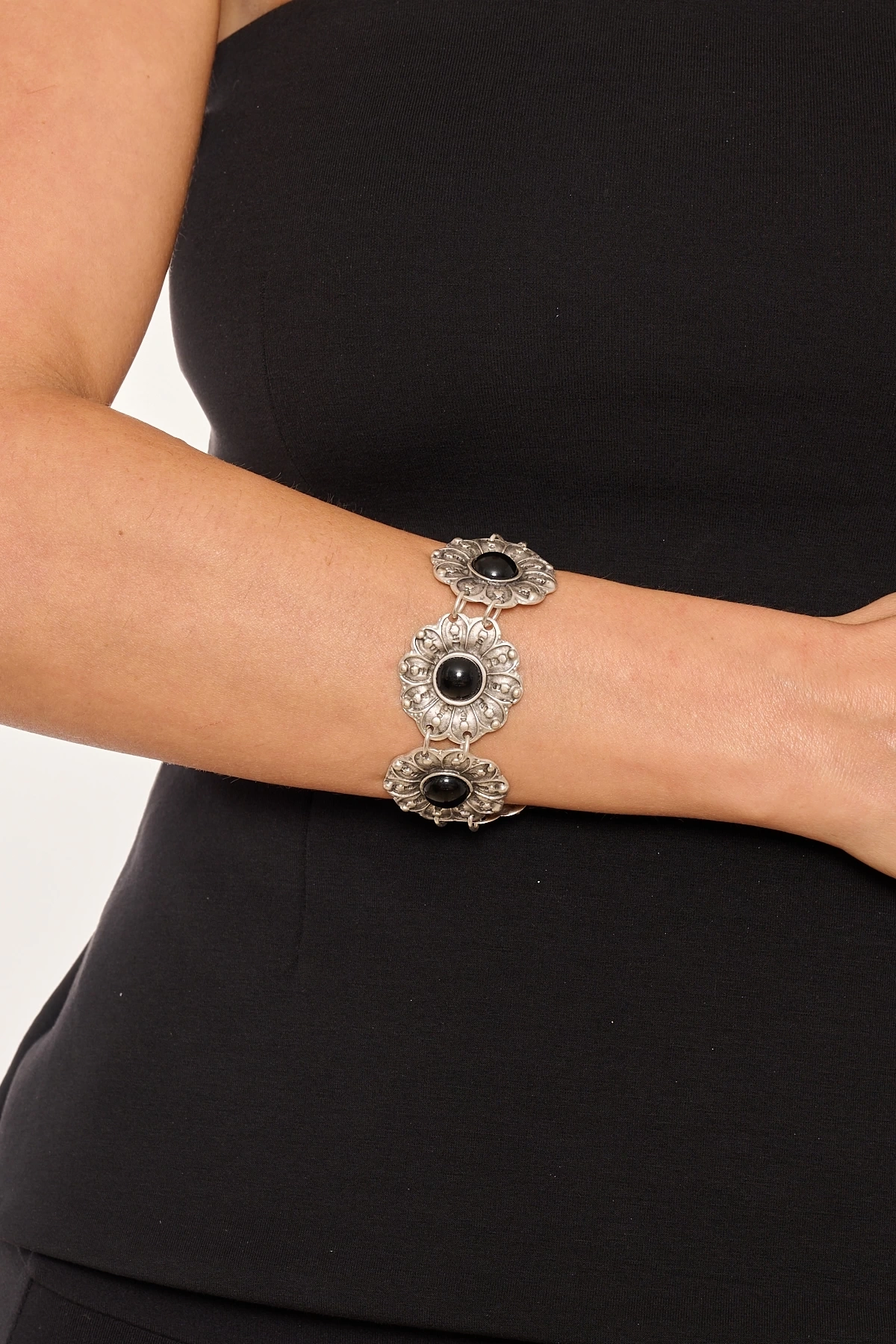 Kiraz Black Stoned Silver Plated Flower Bracelet