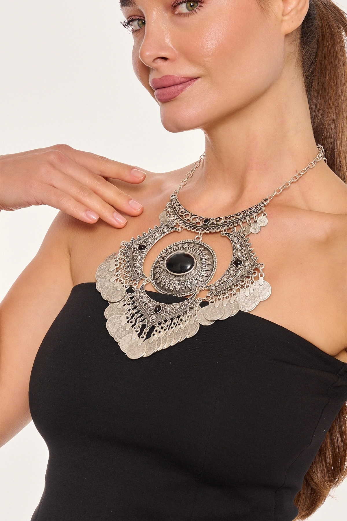 Kiraz Black Stoned Silver Plated Necklace