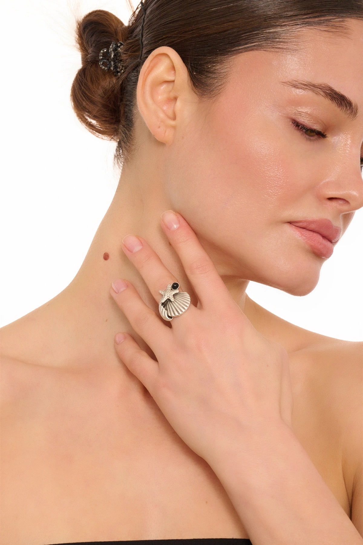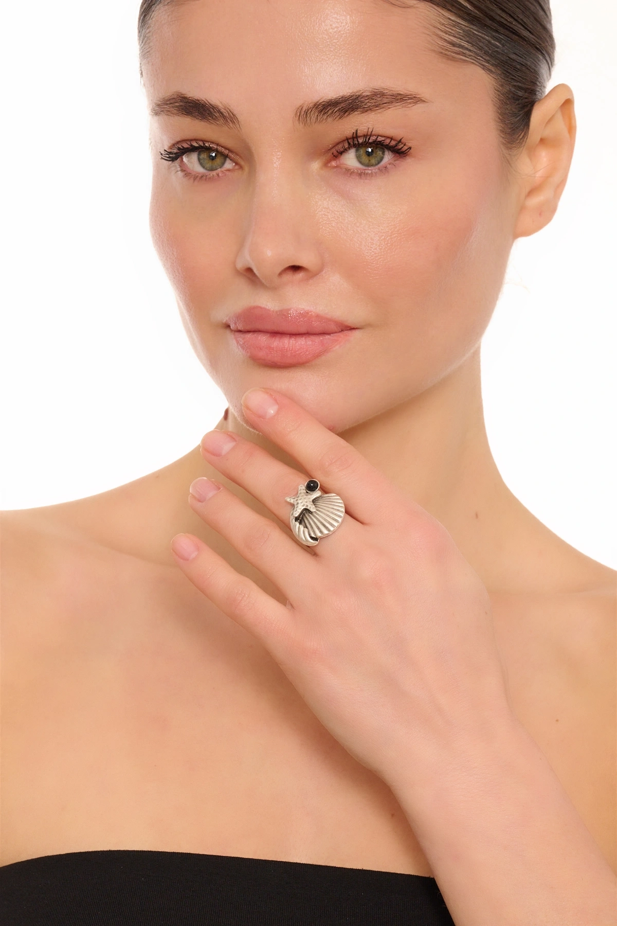 Kiraz Black Stoned Silver Plated Seashell Ring
