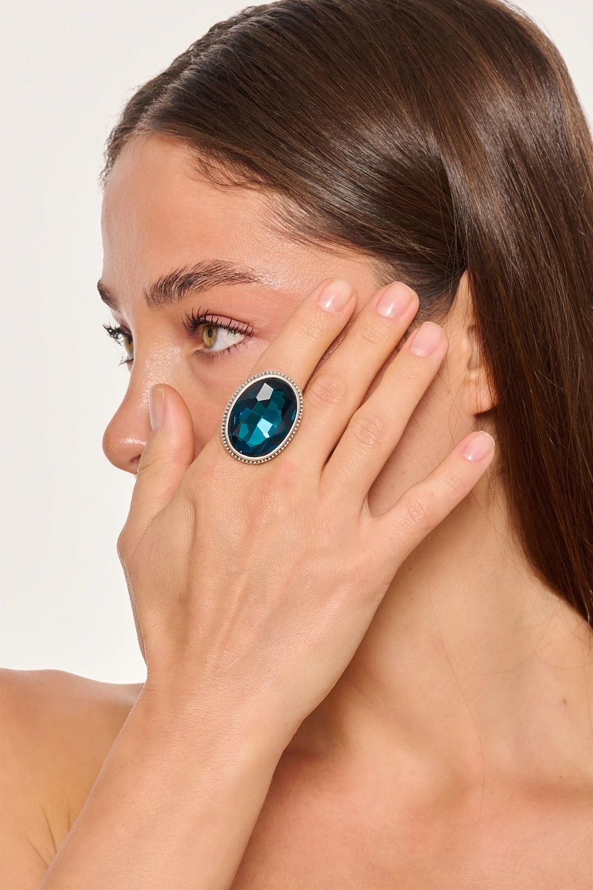 Kiraz Blue Crystal Stoned Silver Plated Ring