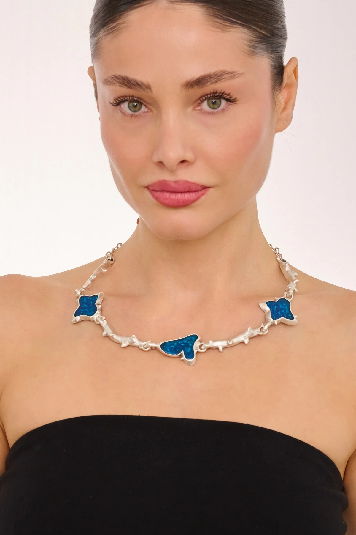Kiraz Leather Navy Blue Crystal Stoned Silver Plated Necklace
