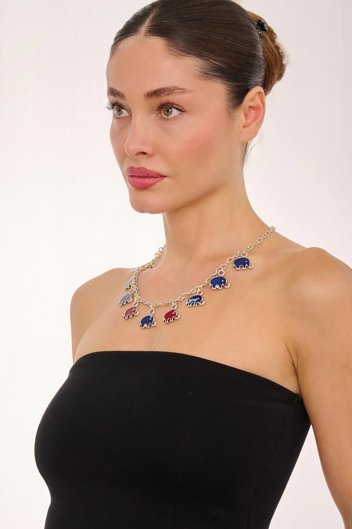 Kiraz Burgundy And Navy Blue Enameled Silver Elephant Plated Necklace