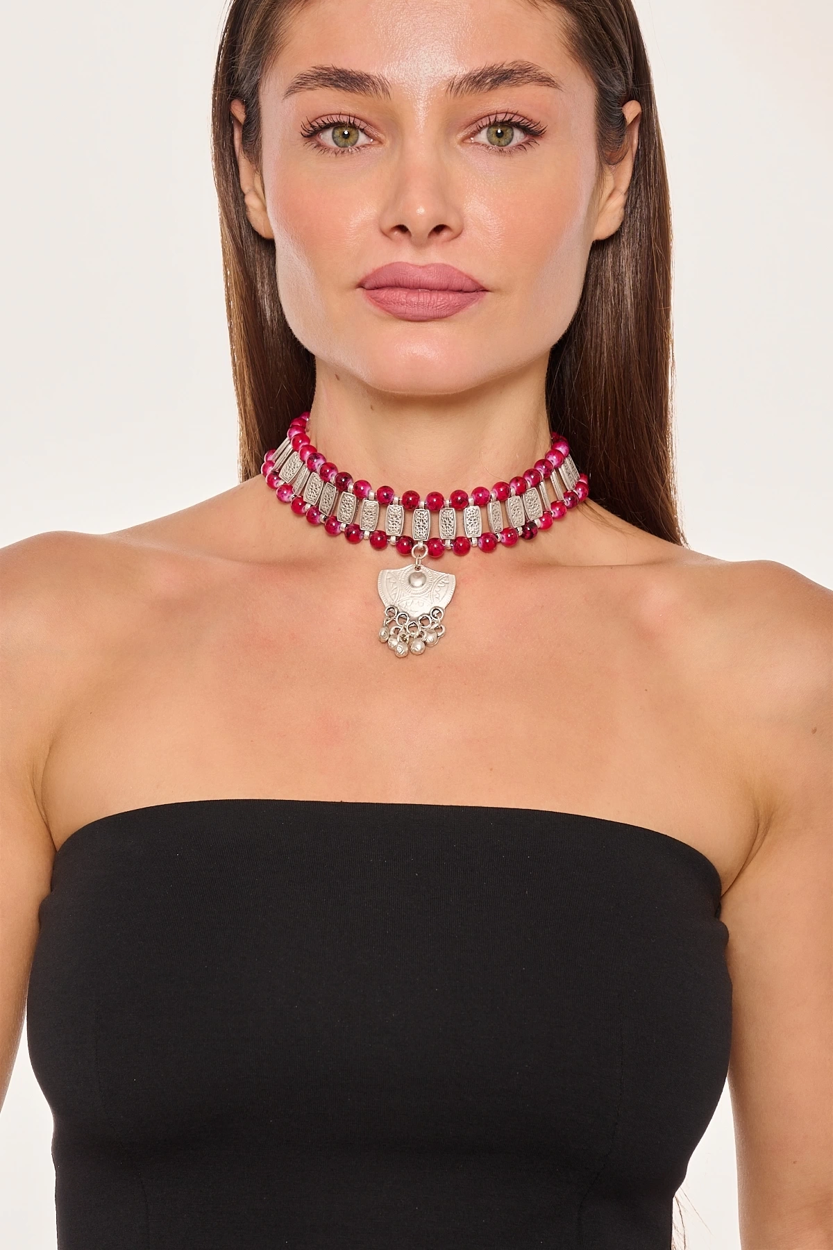 Kiraz Burgundy Beaded Silver Plated Necklace