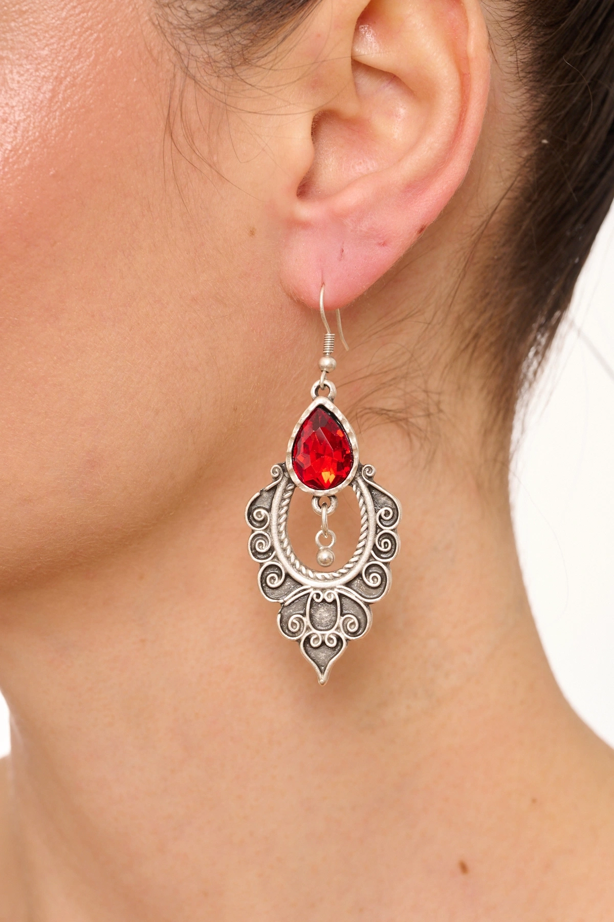 Kiraz Burgundy Stoned Silver Plated Dangling Earring