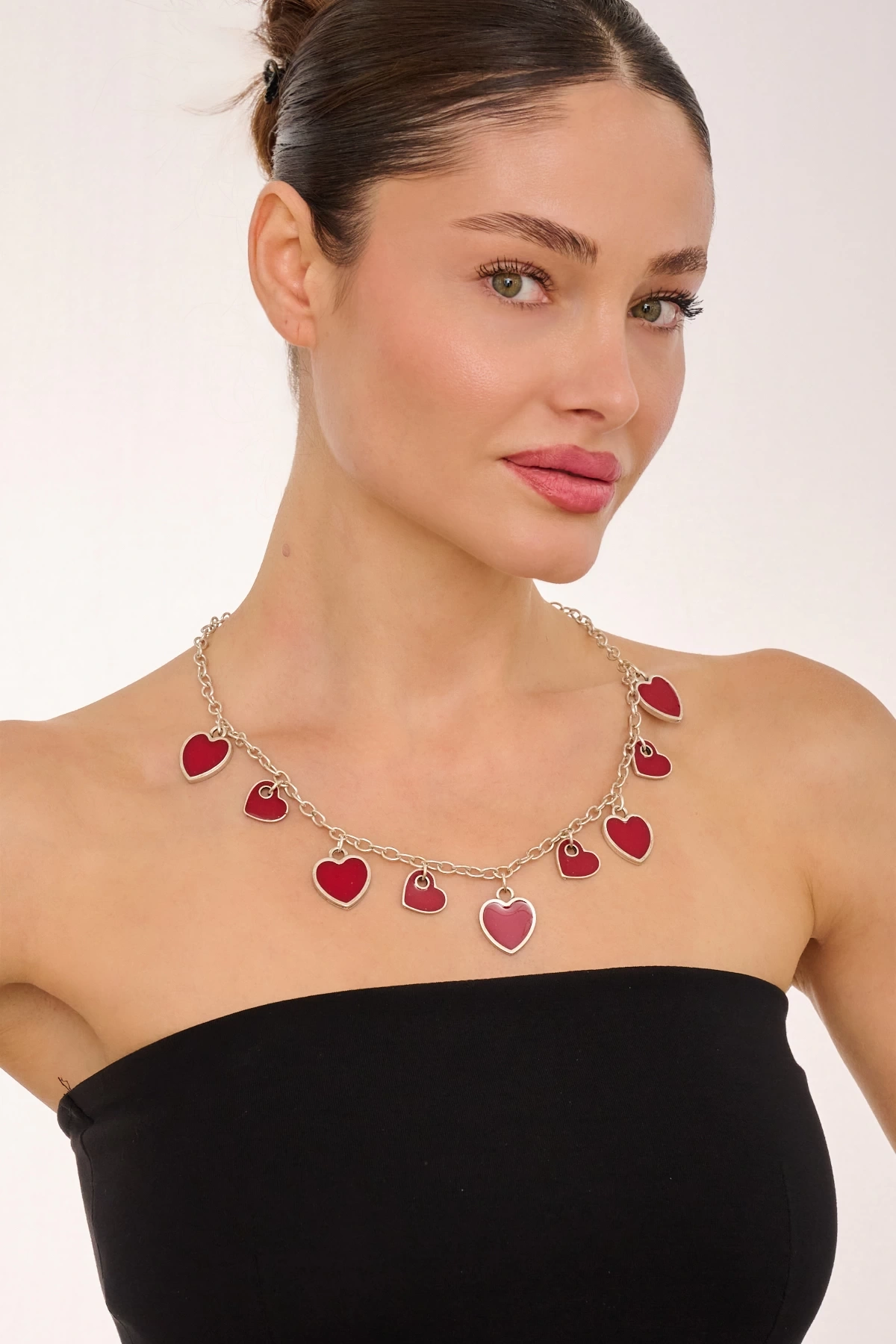 Kiraz Burgundy Enameled Silver Plated Heart Necklace