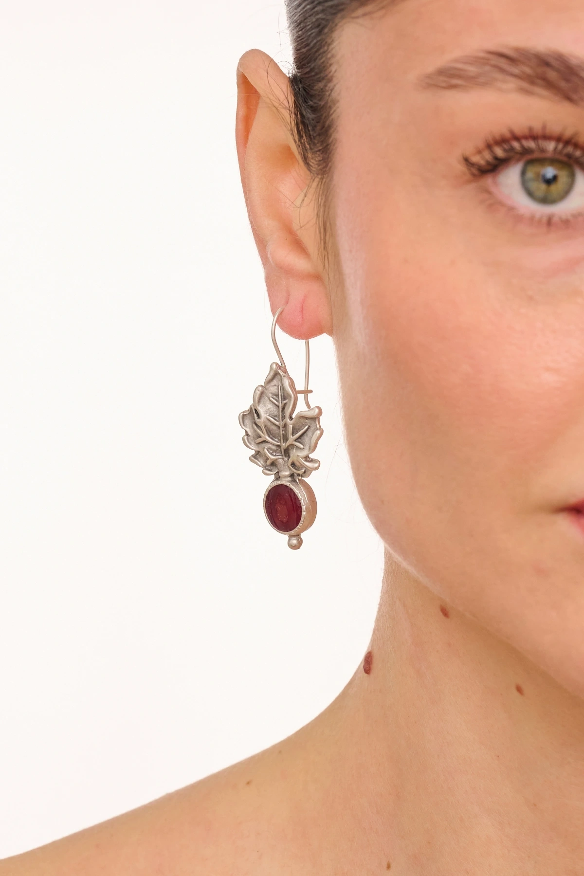 Kiraz Burgundy Enameled Silver Plated Leaf Earring