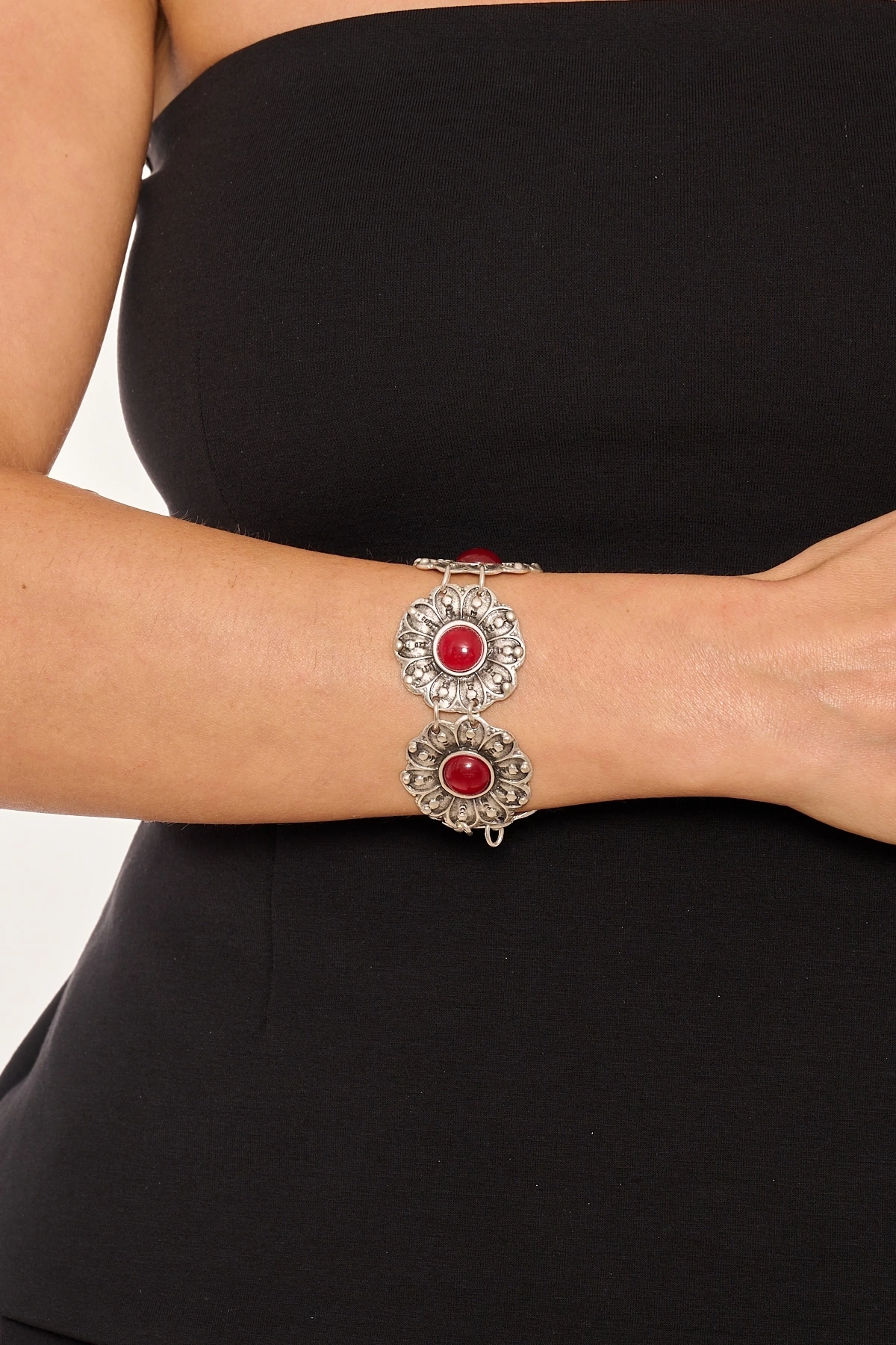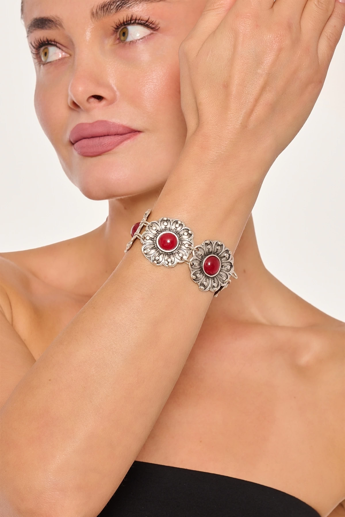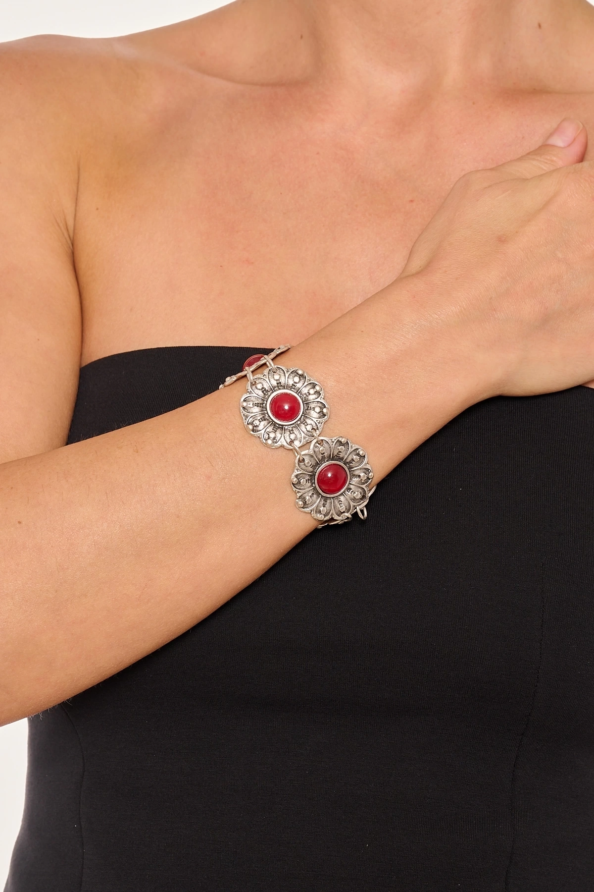 Kiraz Burgundy Stoned Silver Plated Flower Bracelet
