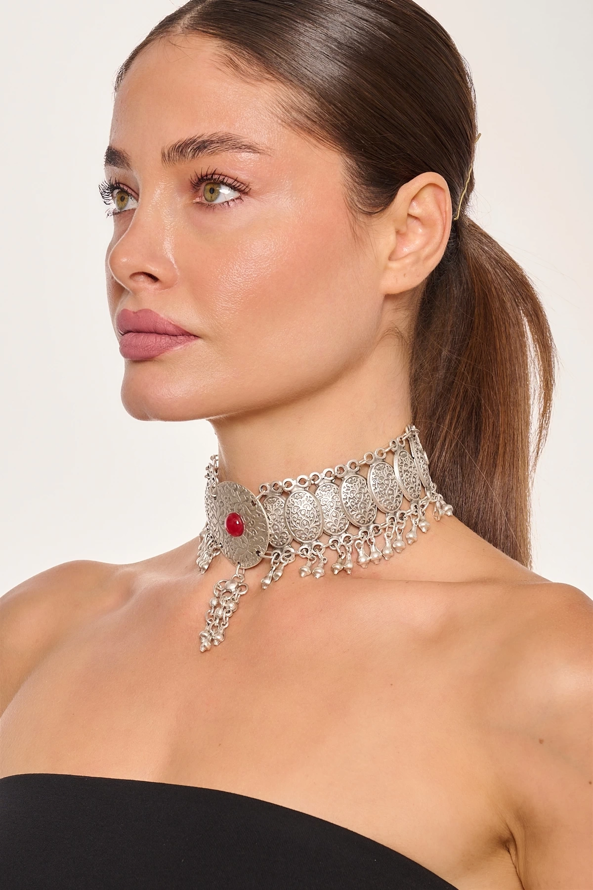 Kiraz Burgundy Stoned Silver Plated Necklace