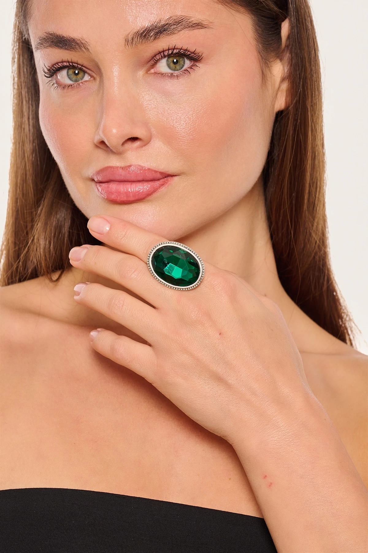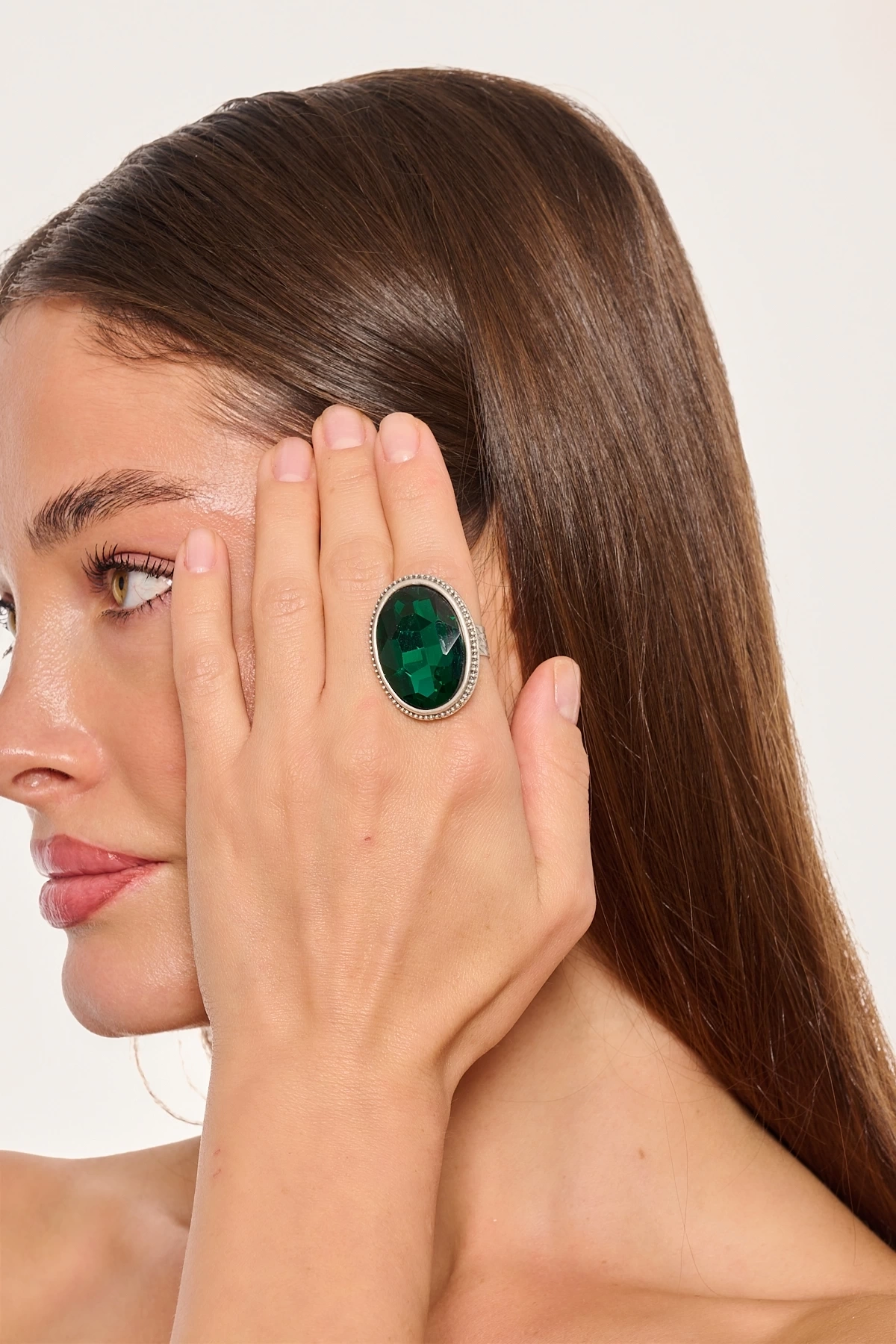 Kiraz Emerald Crystal Stoned Silver Plated Ring