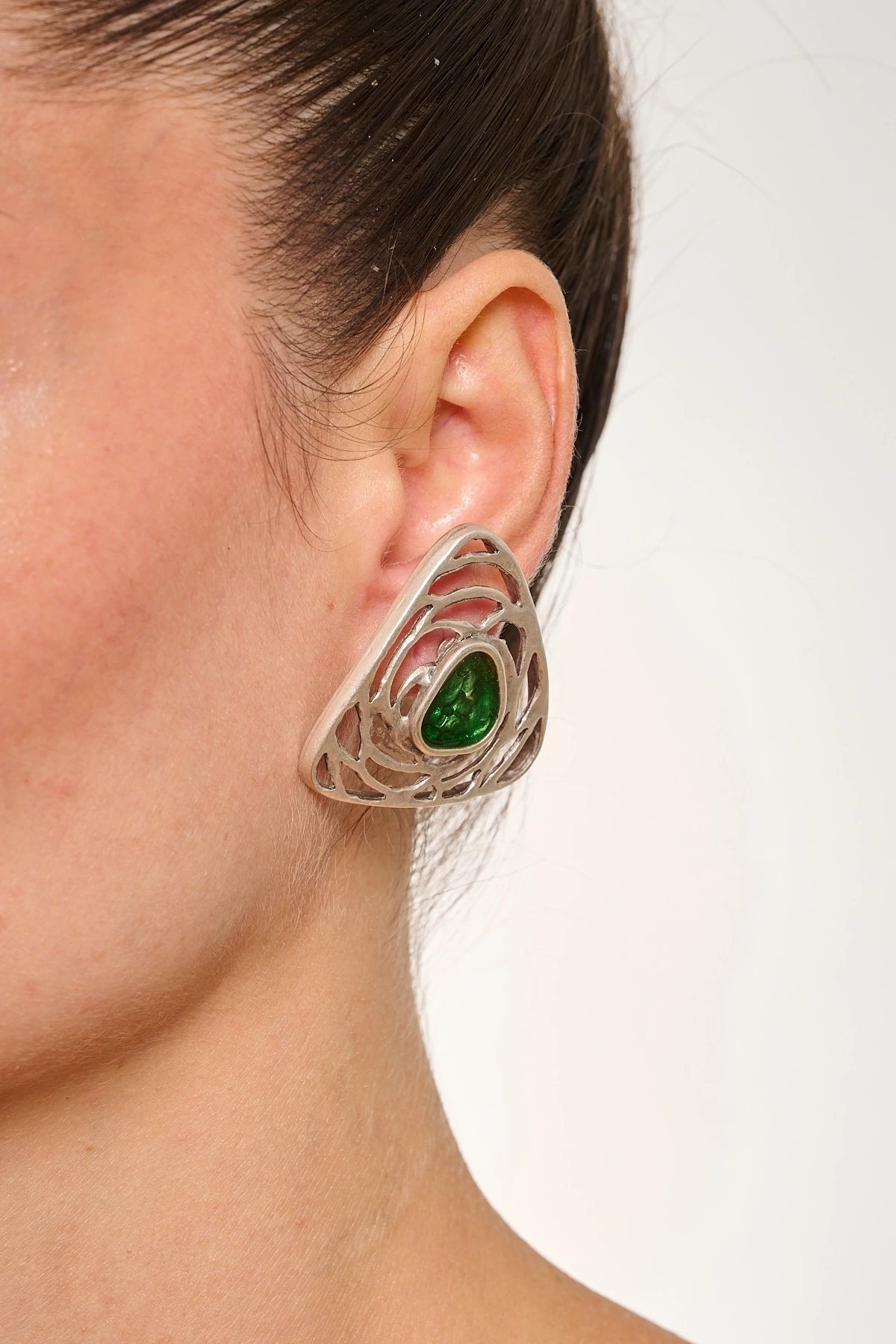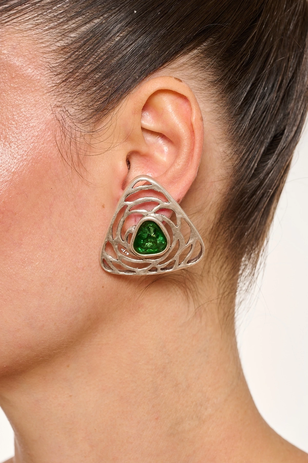 Kiraz Green Enameled Silver Plated Triangle Earring