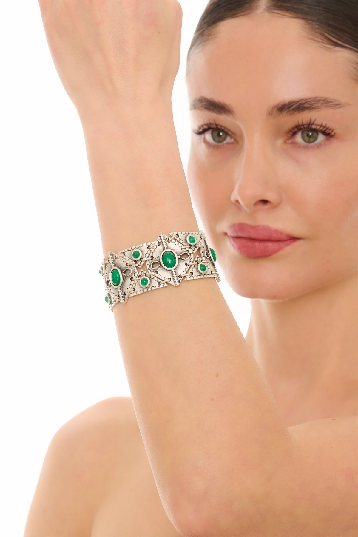 Kiraz Green Stoned Silver Plated Flower Bracelet