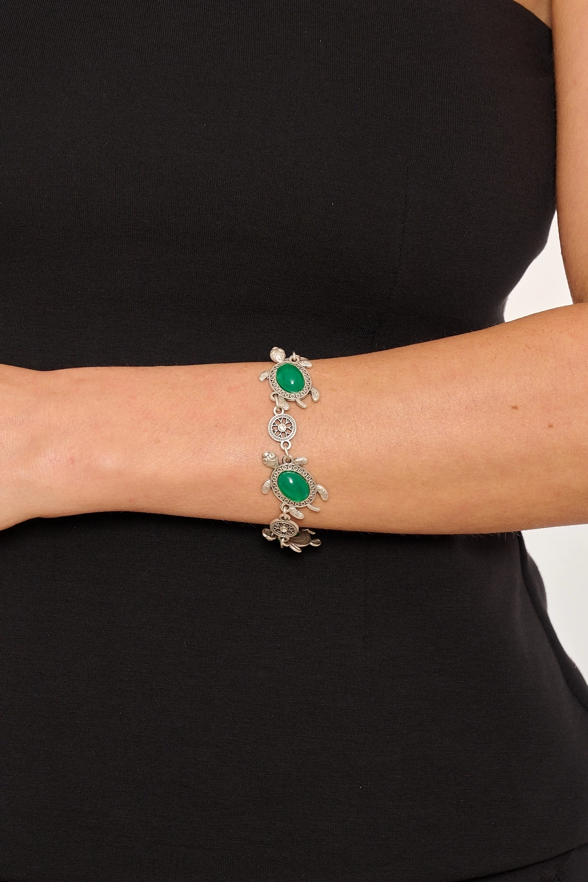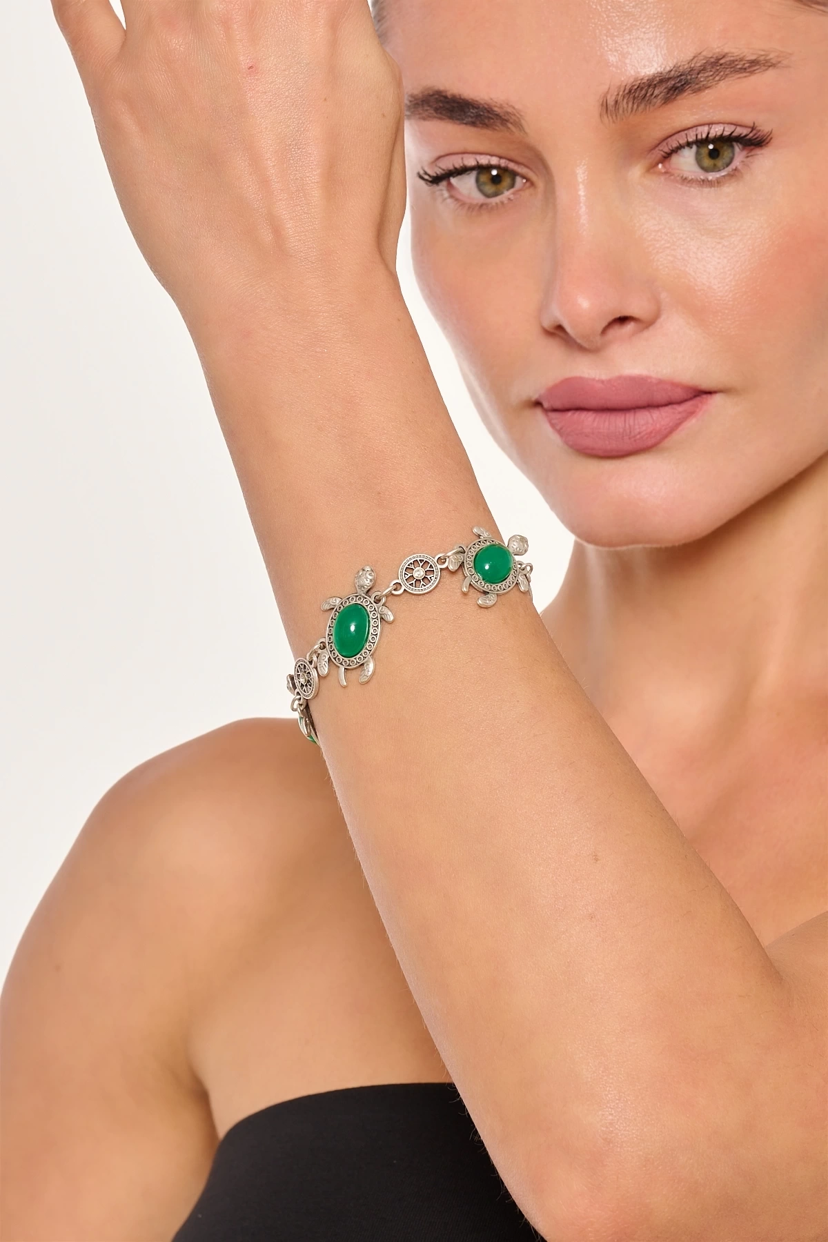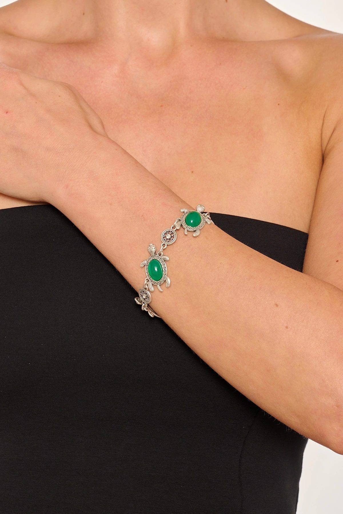 Kiraz Green Stoned Silver Plated Turtle Bracelet