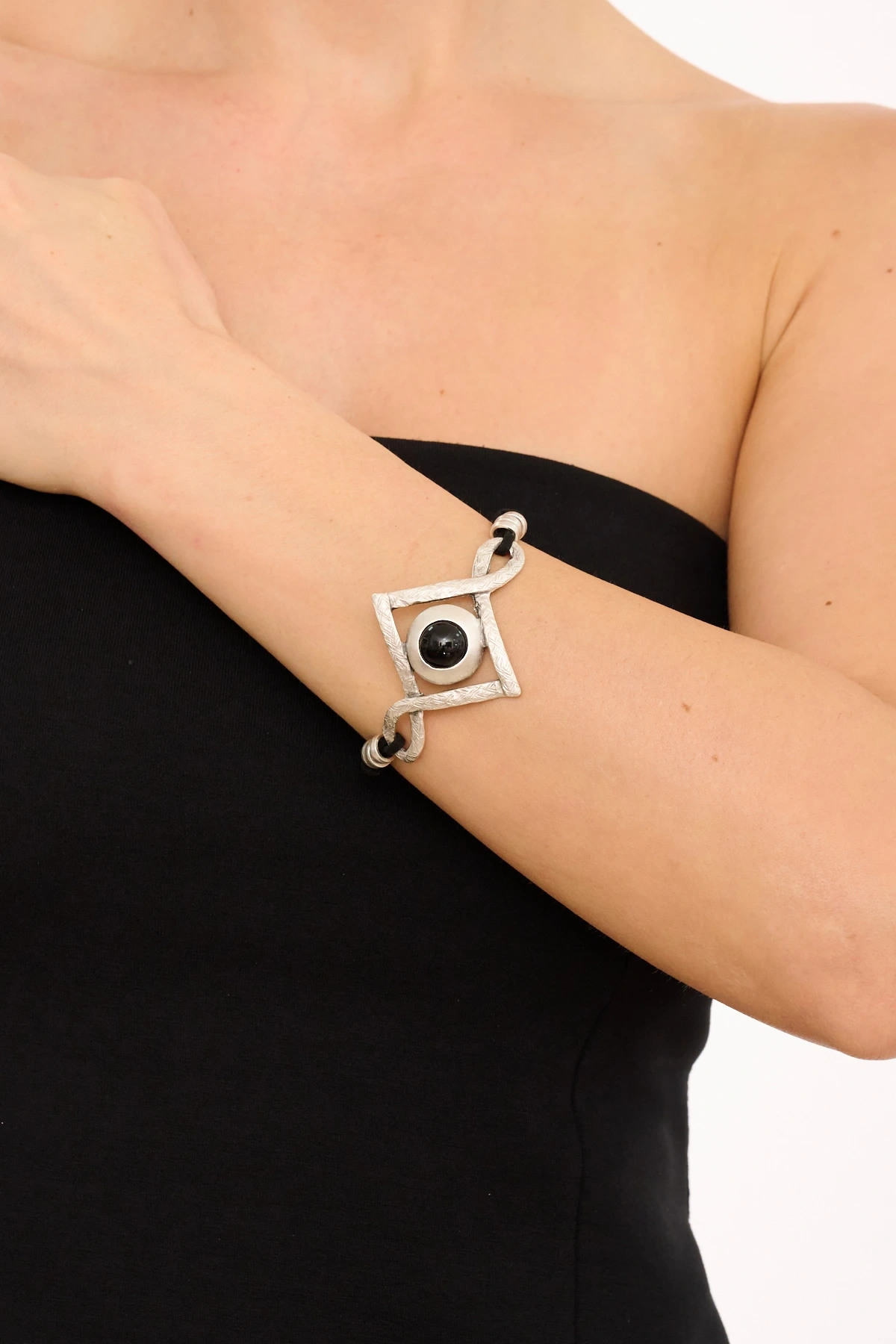 Kiraz Leather Black Stoned Silver Plated Bracelet