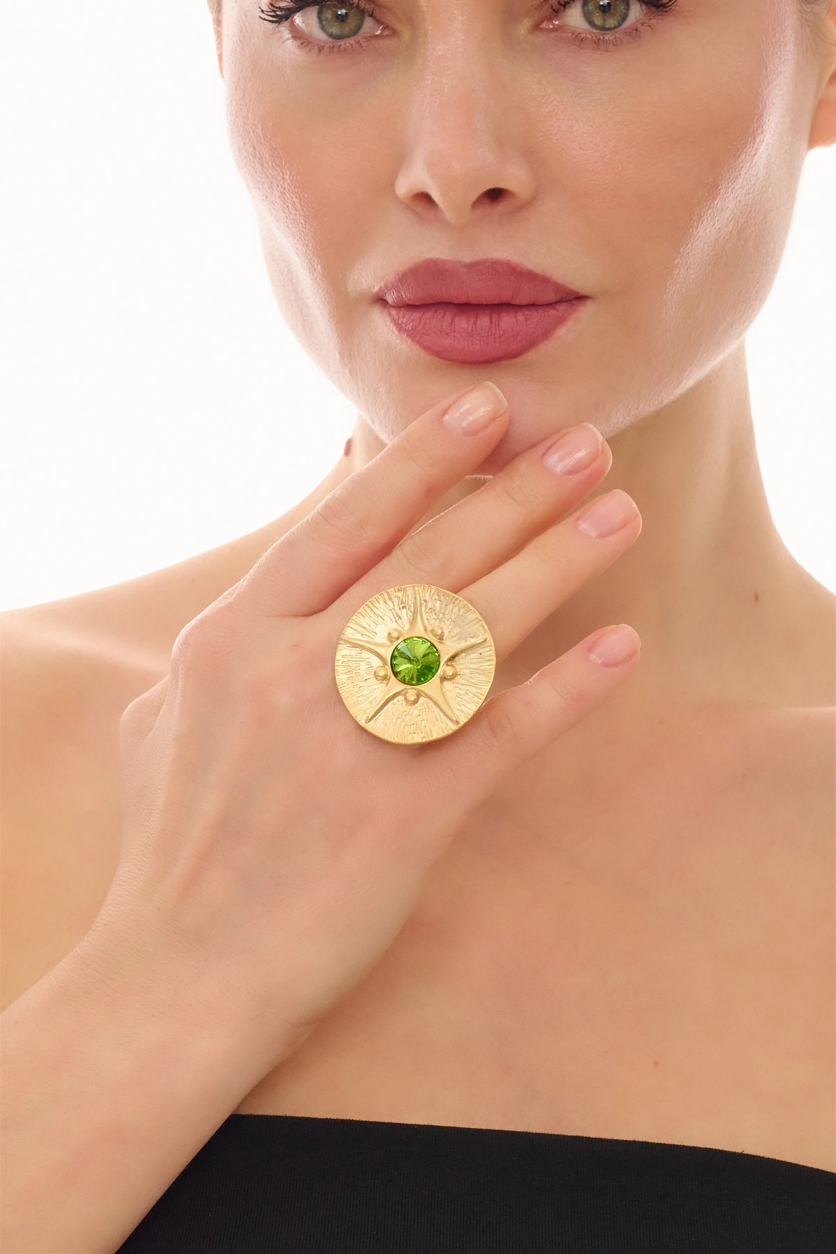 Kiraz Light Green Crystal Stoned Gold Plated Ring