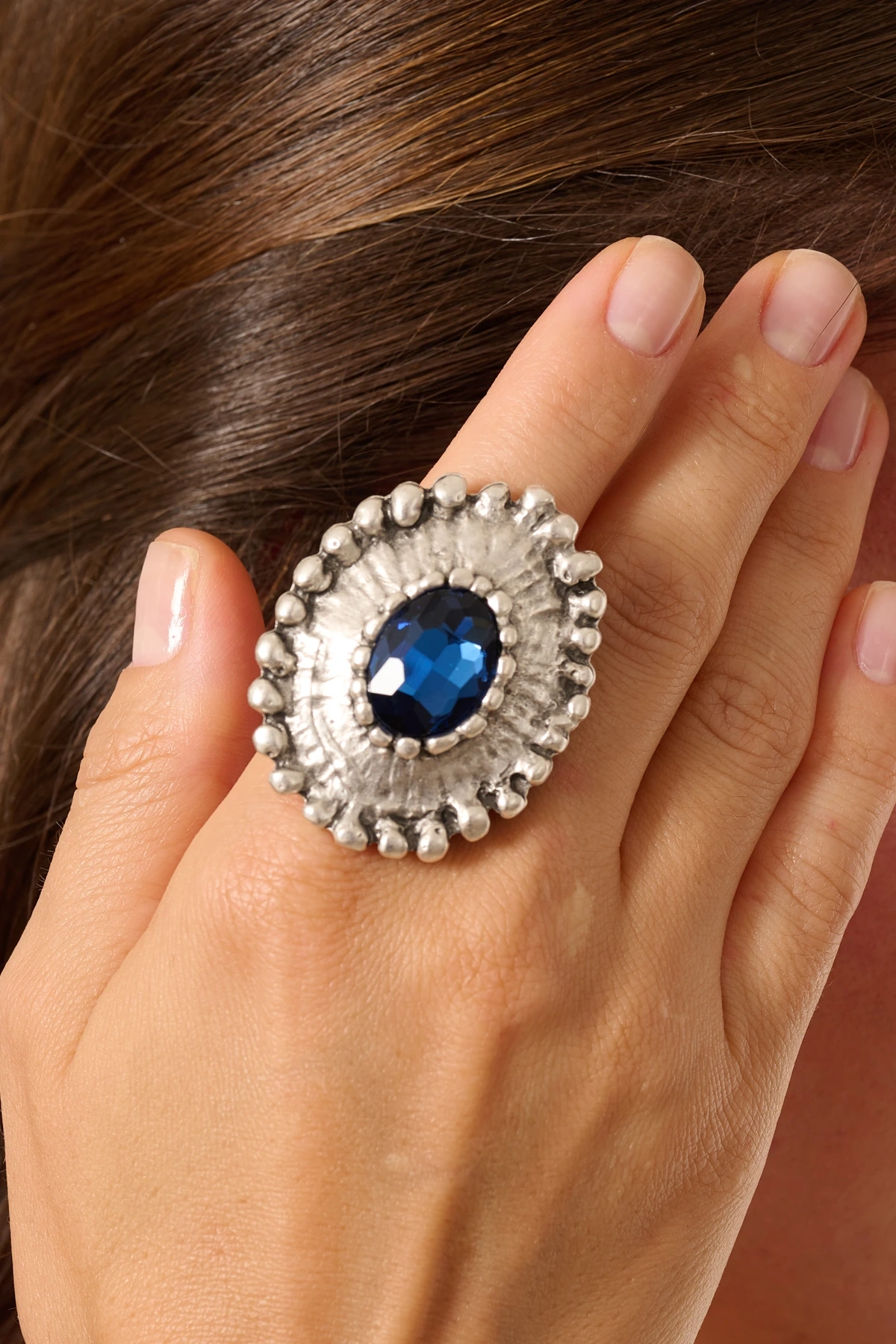 Kiraz Navy Blue Crystal Stoned Silver Plated Ring