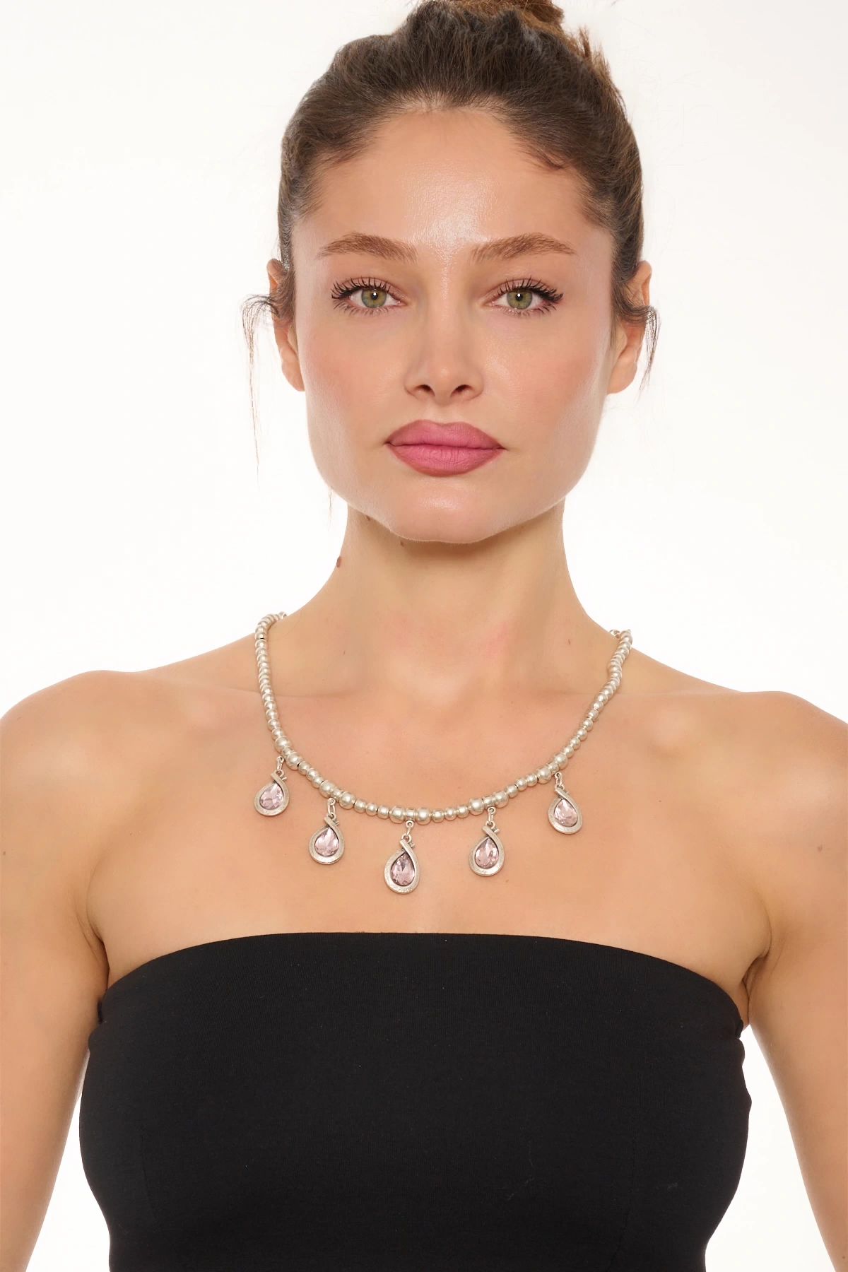 Kiraz Pink Crystal Stoned Silver Plated Necklace