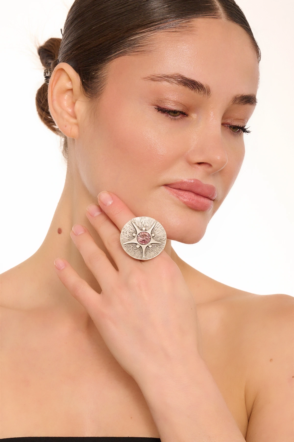Kiraz Rose Color Crystal Stoned Silver Plated Ring