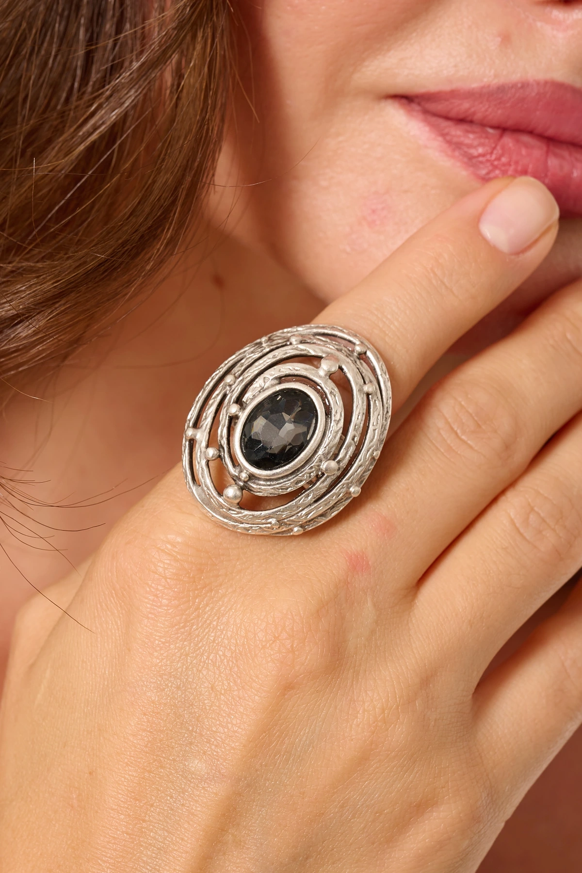 Kiraz Smoked Crystal Stoned Silver Plated Ring
