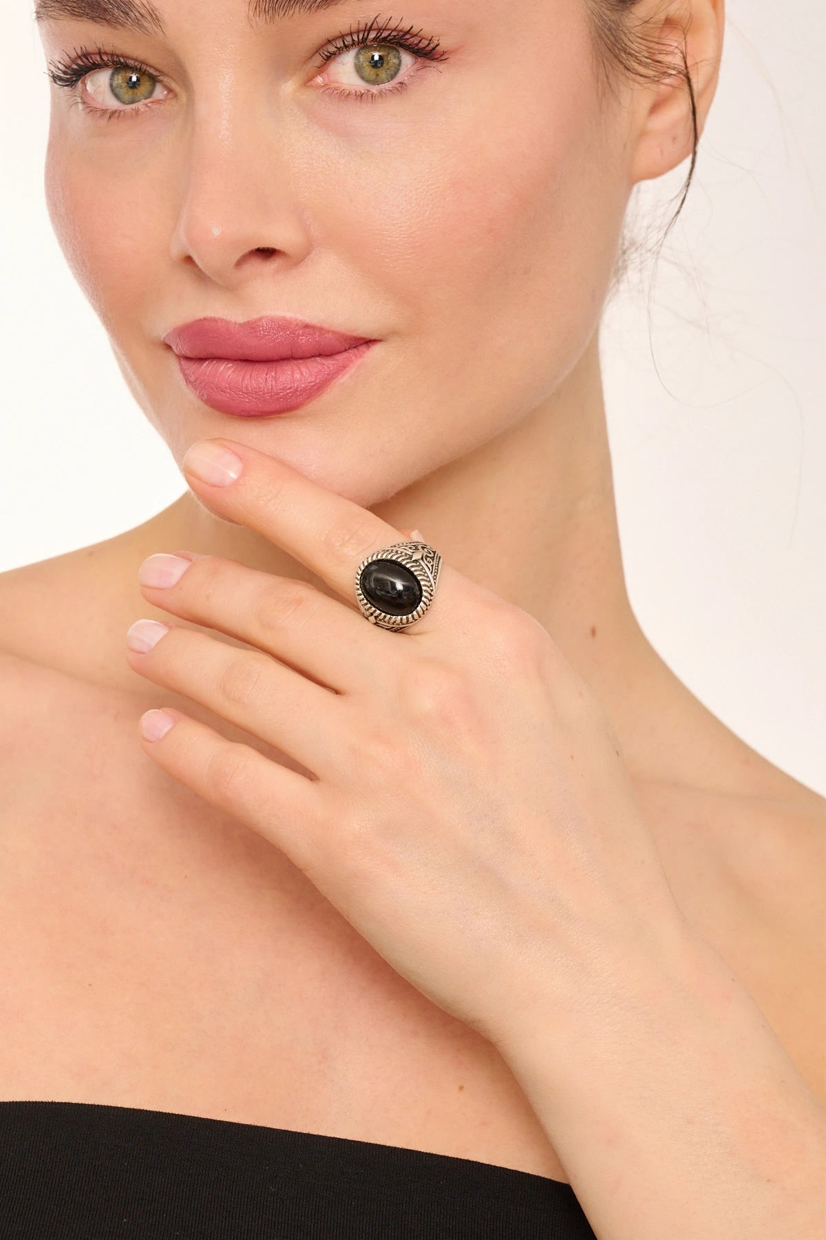 Kiraz Black Stoned Silver Plated Ring